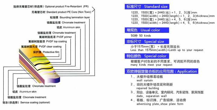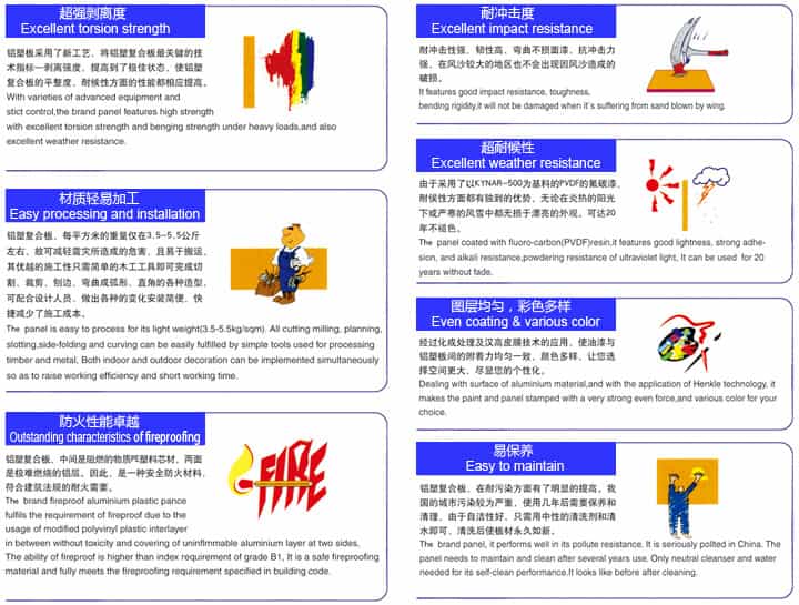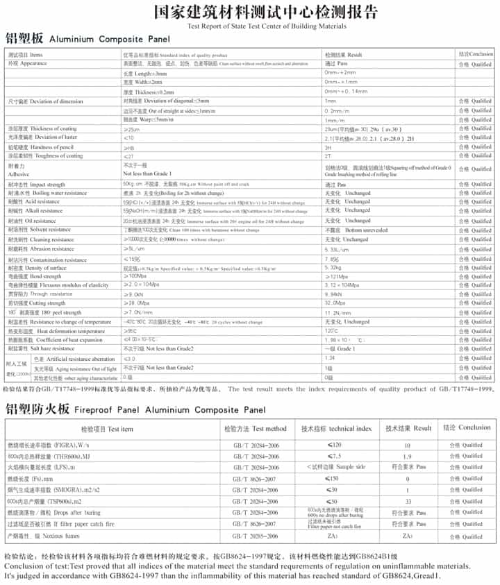 鋁塑板采用西南鋁3000、5000系列,齊魯石化專用塑料,美國DUPONP高分子膜,美國PPG70%以上氟碳含量涂料生產(chǎn)復(fù)合而成,年產(chǎn)量400萬m2。