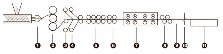 1.塑料擠壓→2.塑板成形→3.貼高分子膜→4.復(fù)合鋁卷→5.熱復(fù)合→6.水輥冷卻→7.風(fēng)機冷卻→8.校平成形→